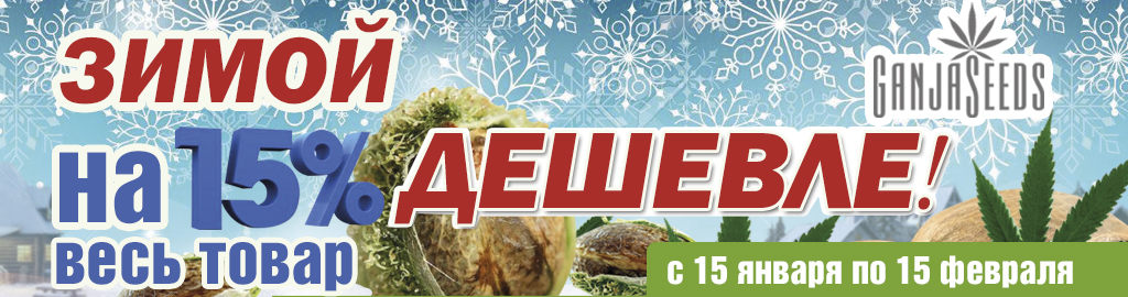 С 15 января по 15 февраля 2019 года делайте покупки в нашем сидбанке и получайте автоматическую скидку 15%. Условия распространяются на все семена конопли без исключения. Лишь несколько кликов и будущие растишки спешат к вам. Делайте покупки, а мы отблагодарим скидкой.