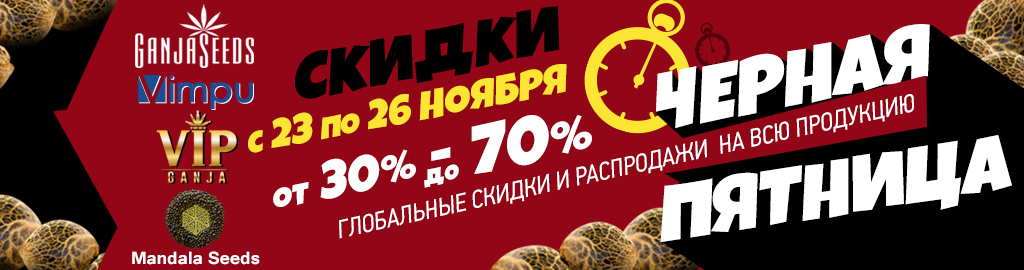 Цены рухнут в период с 23 по 26 ноября на весь перечень товаров! Семена конопли от GanjaVIP, GanjaSeeds и Mandala Seeds, все выпуски украинского журнал посвященного культуре каннабиса «JahPub», а также споровые отпечатки от Gribo4ek - будут доступны со скидкой в 30-70%!