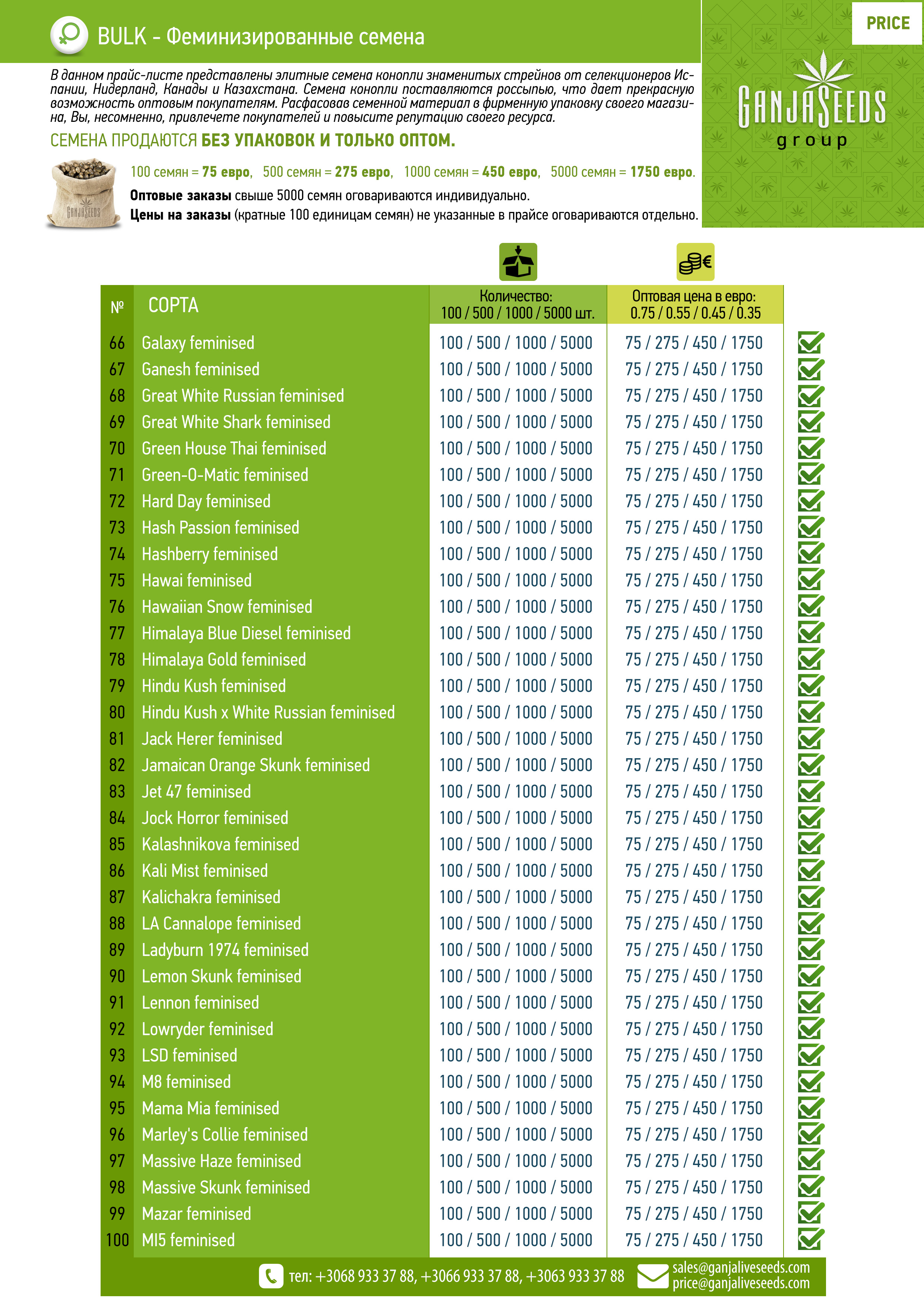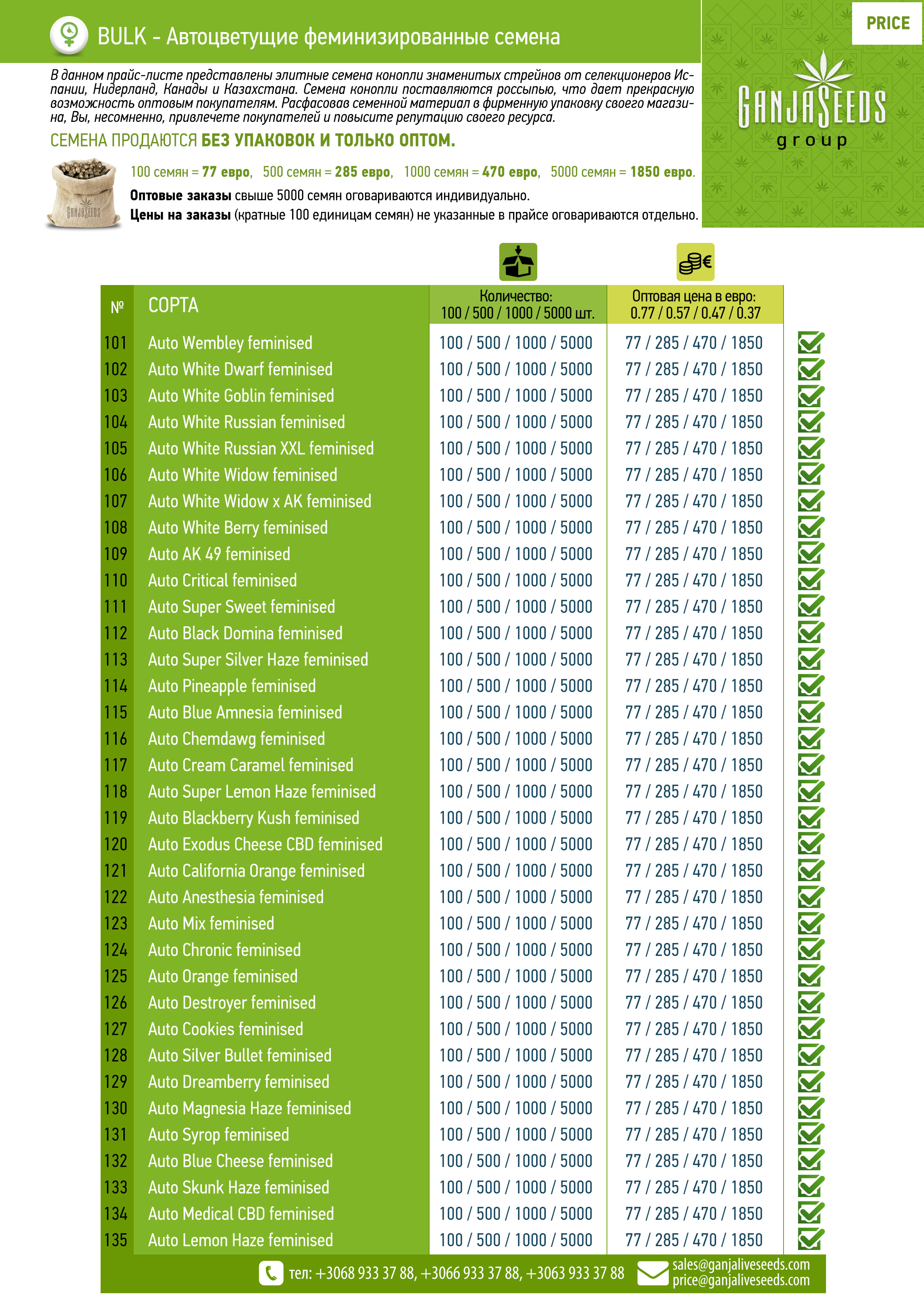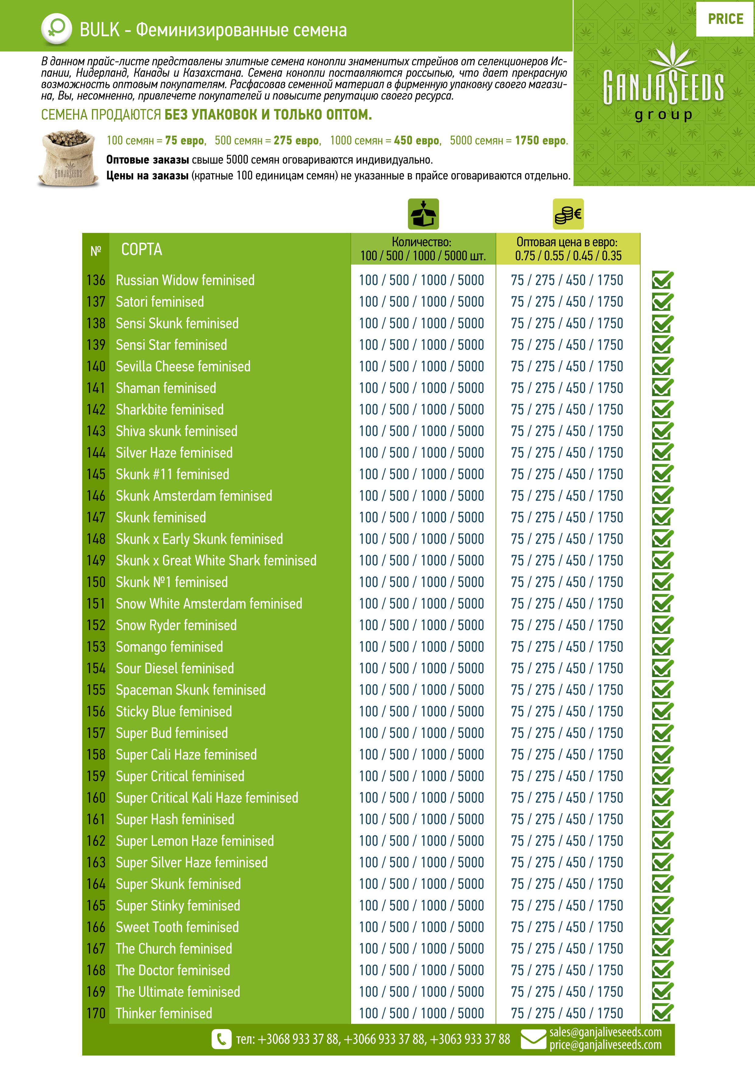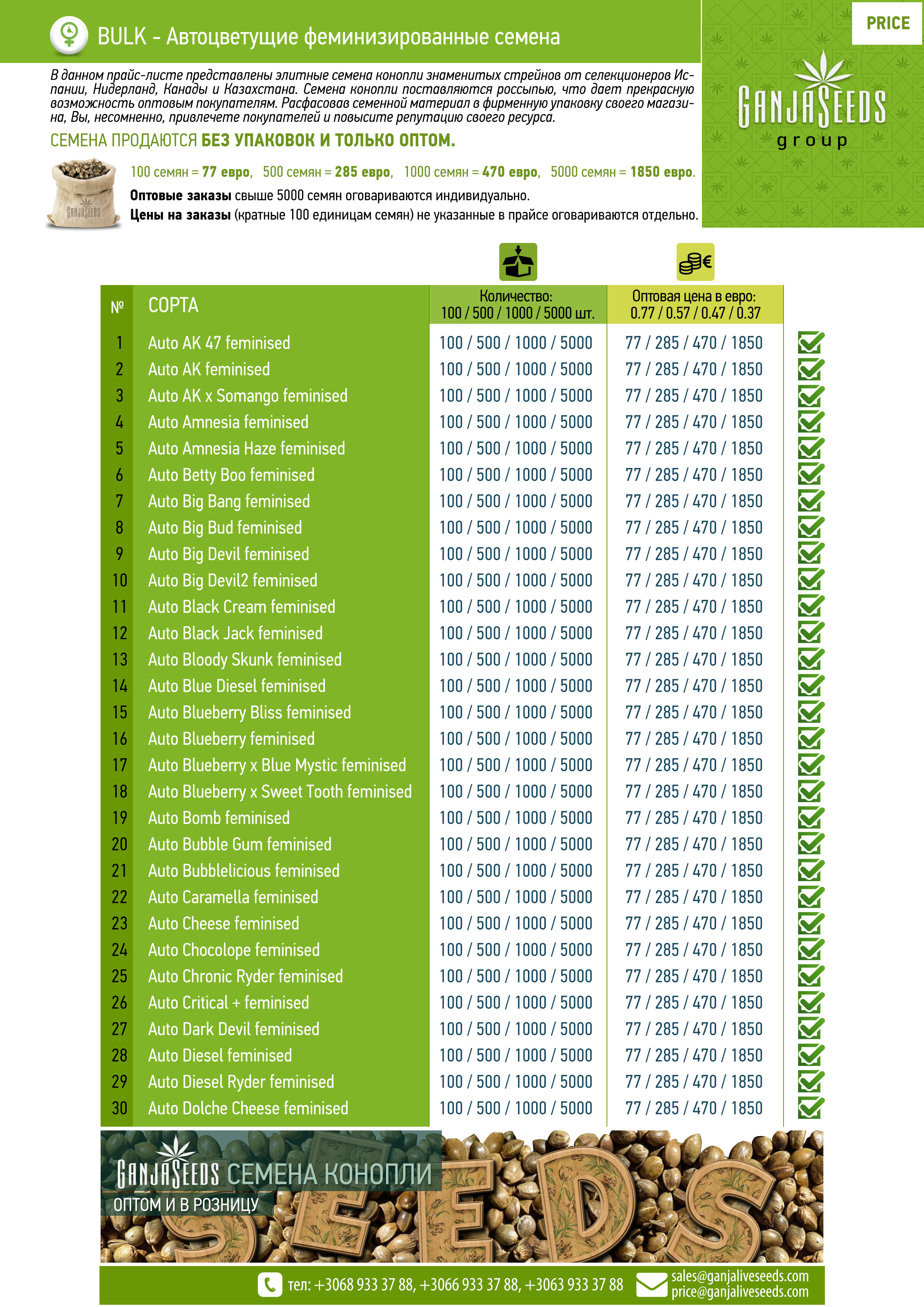 Оптовый прайс семян конопли BULK